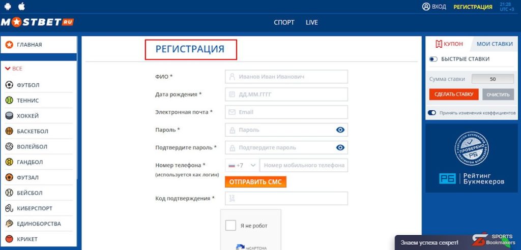 - Перейти к регистрационной форме на сайте или в мобильной версии.